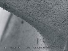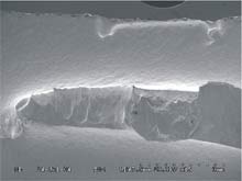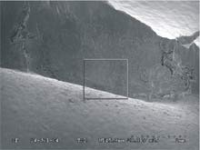 Photos 9 and 10 are SEM images of impact mark at 1st stage rotor bladeleading edge showing the presence of a small imbedded particle.