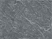 Optical microscopic examination of the 4th stage rotor blade fractures revealed overload features consistent with secondary damage. However, one of the three 4th stage rotor blades that failed closer to the blade root did show what appeared to be macroscopic features of cyclic overload fracture. This blade fracture was sectioned from the rotor for SEM examination at higher magnifications. Examination revealed only overload fracture features and surface rub patterns, but gave the false appearance of cyclic steps when viewed at lower magnifications.