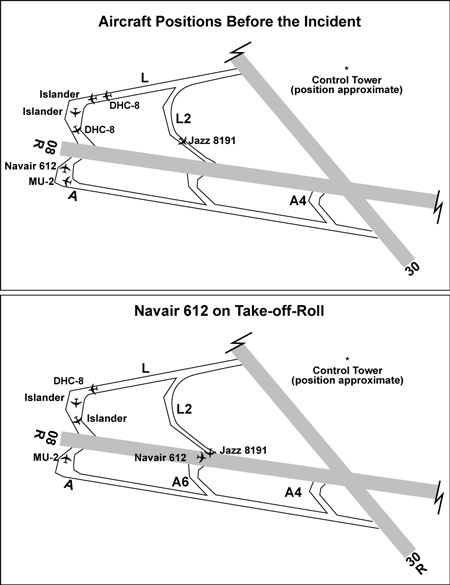 At the time of the occurrence, two arriving aircraft were on final for Runway 08R, and seven aircraft were waiting to depart on Runway 08R (see Appendix A - Aircraft Positions). Aircraft departing on Runway 08R can approach the threshold from either Taxiway A on the south side of the runway, or Taxiway L on the north side. Jazz 8191, one of the waiting aircraft, was on Taxiway L2, on the north side farther down the runway. Of the other six aircraft, four were on Taxiway L (a DHC-8, two Islanders, another DHC-8) and two were across the runway on Taxiway A (the Islander [Navair 612] and a Mitsubishi MU-2).