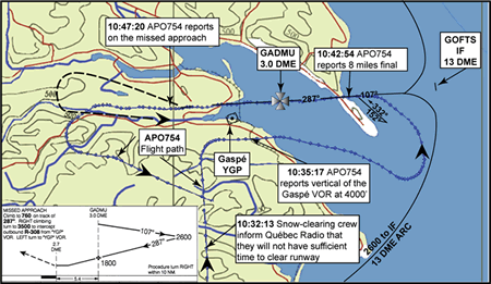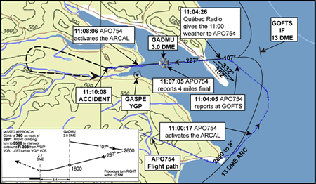 The pilot did not follow the published missed approach procedure (see Appendix B) that requires a climbing turn to the right to 3500 feet above sea level (asl) to intercept Radial 308 outbound of the Gaspé VOR before turning left towards the VOR. Instead, he followed the runway heading for six miles before turning left to follow a heading of 135° to the 13 DME arc for the approach (see Appendix C). At 1104 and 12 miles out on final, the pilot received the 1100 weather report: winds from 290° at 4 knots; visibility ¾ mile in light snow; vertical visibility 1100 feet; temperature −9°C; dew point −8°C; altimeter setting 29.87.