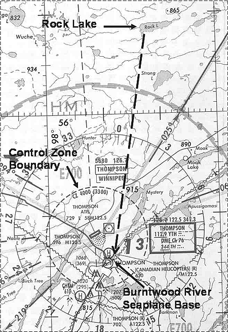 The reported weather at Thompson at the time of the accident was as follows: a few clouds at 400 feet above ground level; ceiling 600 feet broken, 800 feet overcast; visibility 2½ miles in light rain; wind 050° True (T) at 13 knots, gusting to 20 knots; temperature 11°C; dew point 13°C; altimeter setting 29.76; remarks - ceiling ragged. The terminal area forecast, valid from 1400 to 1700, was as follows: wind 040°T at 12 knots; visibility 6 miles in light rain; clouds 400 feet scattered, 1200 feet overcast; from 1400 to 2200 temporarily 3 miles in light rain and fog; ceiling 400 feet broken, 1200 feet overcast. The weather was below the required minimum for visual flight rules (VFR) operations in a control zone.Footnote 2 Weather conditions such as these would require that a pilot obtain a special VFR clearance from air traffic control (ATC) before entering the Thompson control zone. The wind at the water base was producing waves two to three feet high.