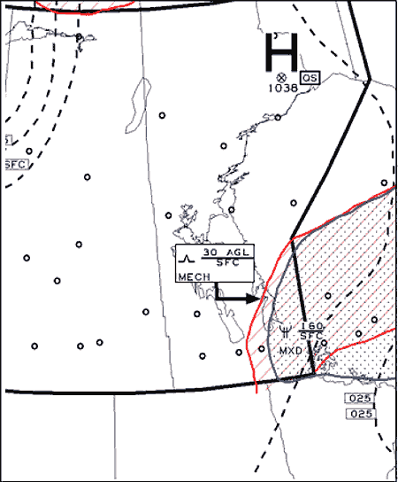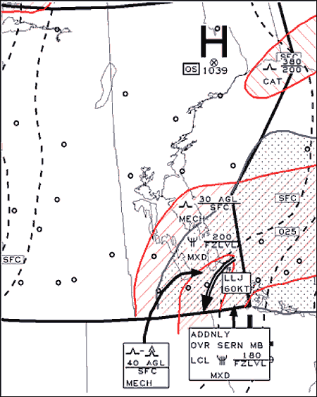The 0100 icing and turbulence chart depicted a low pressure system over northern Minnesota, with a low-level jet stream with northeasterly winds of 60 knots to the north of the low over Manitoba, immediately in the vicinity of the accident site, with moderate-to-severe mechanical turbulence from the surface to 4000 feet agl depicted. The chart depicted the freezing level at the surface in the vicinity of Winnipeg, sloping to 2500 feet asl to the southeast. The chart depicted moderate mixed icing from the freezing level to 20 000 feet asl over most of southern Manitoba, including the Winnipeg area. Over the extreme southeastern corner of Manitoba, the chart depicted local severe mixed icing from the freezing level to 18 000 feet asl.