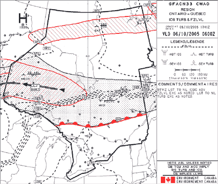 Graphic area forecasts (GFAs) are issued four times daily with a coverage period of 12 hours. Each issue is a collection of six charts: two charts valid at the beginning of the forecast period, two charts valid 6 hours into the forecast period, and the final two charts valid 12 hours into the forecast period. Two charts are issued for each specified time: one chart depicts clouds and weather conditions, and the other chart depicts icing, turbulence, and freezing level conditions. Amendments to area forecasts are issued as AIRMETs. GFAs valid for 0100 and 0700 were issued for the Prairies region, covering the Winnipeg area, at 0031 and 0041, respectively (see Appendix B - Graphic Area Forecasts for the Route of Flight). No AIRMET amendments were made to these GFAs.