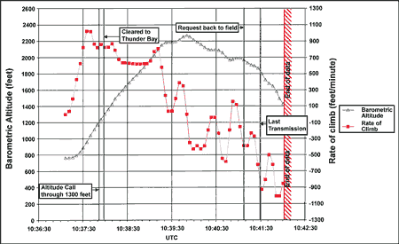 The aircraft climbed on runway heading for about one minute to an altitude of 1300 feet above sea level (asl), 500 feet above ground level (agl). The flight was cleared to 9000 feet asl direct to Thunder Bay, and the pilot turned on course. The aircraft continued to climb, reaching a maximum altitude of 2400 feet asl about 2.5 minutes after take-off. The aircraft then started a gradual descent averaging about 400 feet per minute (fpm) until it descended below radar coverage. The accident occurred during hours of darkness at 0543. The Winnipeg Fire Paramedic Service were notified and responded from a nearby station.