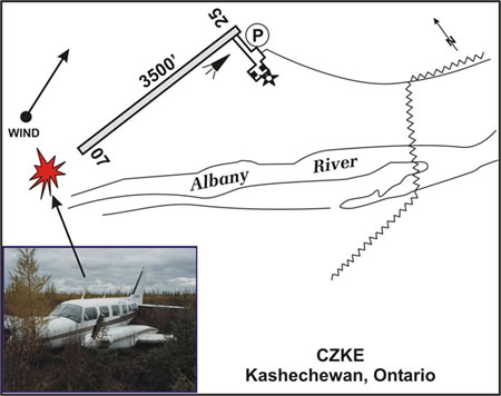 The Wabusk Air Piper PA-31 Navajo aircraft (registration C-GKMW, serial number 725) departed Runway 25 at Kashechewan, Ontario, at approximately 2130 eastern daylight time on a night visual flight rules flight to Moosonee, Ontario, 72 nautical miles to the southeast. The captain was the pilot flying and was seated in the left seat. The aircraft became airborne approximately halfway down the runway, and the flight crew lost sight of the runway lights and any visual reference to the ground shortly after take-off. The captain selected the landing gear up, and, at 200 feet above ground level, the first officer selected the flaps up, after which the captain set climb power. There was a slight drop in manifold pressure on the left engine, and the captain was readjusting the power when the aircraft struck the ground. The aircraft bounced into the air and came to rest approximately 300 metres past the departure end of the runway. The aircraft was substantially damaged by impact forces. The six passengers and two pilots were not injured.