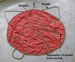 It is most likely that the polypropylene rope, used to snug the top of the bonnet, slid up the beckets and the bonnet opened in flight. The pilot described seeing the starboard front area of the bonnet folded in, likely because the separated becket allowed the formation of an asymmetric shape. The resulting shape and the bonnet's light weight and high drag allowed the bonnet to fly up and into the flight path of the helicopter, carrying the longline with it. The longline subsequently came into contact with the tail rotor and disabled it, rendering the helicopter uncontrollable.