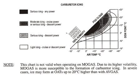 In most accidents involving carburetor icing, the pilot has not fully understood the carburetor heat system of the aircraft and what occurs when it is selected. Moreover, it is difficult to understand the countermeasures unless the process of ice formation in the carburetor is understood. Detailed descriptions of this process are available in most good aviation reference publications and any AME employed on type can readily explain the carburetor heat system. The latter is important because of differences in systems. The pilot must learn to accept a rough-running engine for a minute or so as the heat melts and loosens the ice which is then ingested into the engine. The following chart provides the range of temperature and relative humidity which could induce carburetor icing.