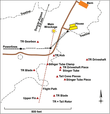 During the last 300 feet of the flight path, the tail rotor assembly broke away from the helicopter. The helicopter climbed steeply then descended rapidly to the ground. An explosion and fireball occurred at ground impact, and the helicopter came to rest on its left side. Both occupants were fatally injured at impact, and the cabin and pylon areas were destroyed by impact forces and fire. The wreckage distribution patterns and the dimensions of the debris trail are characteristic of an in-flight break-up event (see Figure 1).