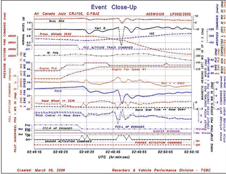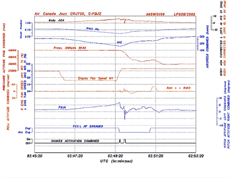 In anticipation of traffic metering into Calgary, the captain, who was the pilot flying, reduced power to slow from the cruise speed of 0.77MFootnote 3 to the long range cruise speed of 0.70M. The flight director was set to altitude track mode with the autopilot engaged. The captain then focused attention to the flight management system (FMS) on the centre console to help the first officer determine fuel reserves for a possible hold. About 90 seconds later, the first officer noticed the speed dropping below 0.70M and warned the captain. The captain responded by advancing the thrust levers. The aircraft continued to decelerate with increasing nose-up pitch attitude while maintaining FL 400. The captain then began programming a descent in the flight control computer (FCC) vertical speed mode. Immediately thereafter, as the airspeed decreased to 0.61M (180 knots indicated airspeed (KIAS)), the stick shaker activated and the autopilot disengaged. Both pilots pushed the control yoke forward to reduce the pitch attitude, which resulted in a descent and an increase in airspeed. This was followed by the crew returning the aircraft to a pitch-up attitude, with an increase in body angle of attack and G.Footnote 4 A second stick shaker activation occurred 11 seconds after the first. Buffeting and roll oscillations of about 10 degrees accompanied the stick shaker events. The pitch attitude was further reduced and the airspeed recovered to 0.82M (250 KIAS). The altitude stabilized briefly at FL 386 before the crew coordinated with ATC, a further descent to FL 380 due to conflicting traffic. (See Appendices A and B for digital flight data recorder plots.)
