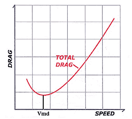 Minimum drag speed (Vmd) is defined as the speed at which aircraft total drag is at a minimum, requiring minimum thrust for level flight. This speed is associated with the endurance speed. At a constant altitude, progressive reduction in true airspeed below Vmd results in a concomitant increase in total drag, which results in a further deterioration of airspeed. Therefore, airspeed values below Vmd can result in negative stability (see Figure 1). Should cruise airspeed become less than Vmd, speed restoration can be accomplished by increasing engine power, by initiating a descent, or a combination of both.
