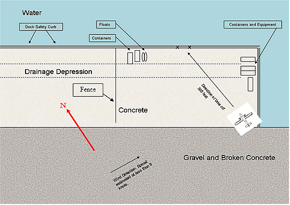 The orientation of the concrete-surface dock is northwest to southeast (see Appendix A). There is a dividing chain-link fence at the midpoint of the dock running perpendicular to the dock edge. There is a 14-inch-high wooden safety curb, made of wood beams measuring 12 inches by 12 inches, surrounding the outside perimeter of the dock. Approximately 105 feet from the water side, in the direction of the take-off, there is a depression approximately 60 feet wide and 1.5 feet deep in the surface of the dock, running parallel to the edge or 45° to the direction of take-off.