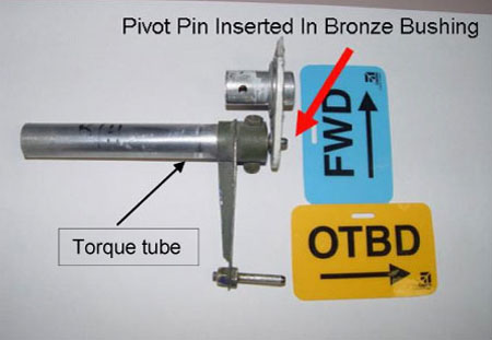 When the wings are installed, the pivot pin on the outboard end of the flap-drive torque tube must be guided into the bronze bushing on the flap arm (see Photo 1). The pin must be visually checked from underneath the aircraft to ascertain that the correct assembly has been accomplished. As a further check of the assembly, the flaps should be extended and retracted using cockpit controls.