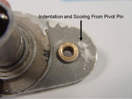 A detailed examination of the right flap hinge arm assembly revealed indentations and a crack in the bronze bushing. There were circular score marks and indications of smearing on the material adjacent to the bushing. These marks had the appearance of being made recently and were consistent with damage that would occur during movement of the flaps. The indentations corresponded in size and radius to the guide pin installed in the end of the flap drive torque tube. The radius of the circular score marks and rubbing corresponded with the radius of the flap drive torque tube. The smearing indicated that the torque tube had moved upward and aft around the bronze bushing (see Photo 2).