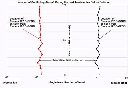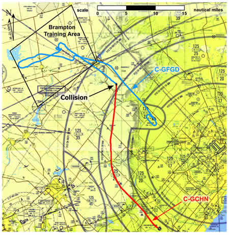 Radar data indicated that C-GFGD was descending progressively from 3800 feet to 2400 feet on a southeasterly track toward the Brampton Airport while C-GCHN was northbound toward Collingwood maintaining an altitude of 2400 feet. The two aeroplanes converged at an angle of 120° with a rate of closure of approximately 200 knots (340 feet per second). The flight paths and collision geometry are depicted in Appendices A and B. Each aeroplane presented an aspect angle 30° to the other.