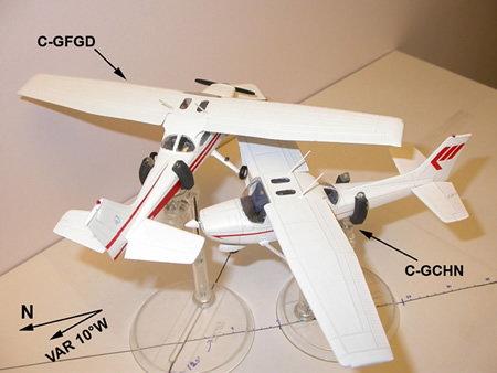 On 04 August 2006, two light aeroplanes collided in mid-air approximately 1 nm west of the town of Caledon, Ontario. Both aeroplanes were operating in accordance with visual flight rules in Class E airspace. The collision involved a Cessna 172P aeroplane (serial number 17275680, registration C-GFGD) operated by the Brampton Flying Club and being flown by an instructor and student, and a Cessna 182T aeroplane (serial number 18281612, registration C-GCHN) being flown by its owner. C-GFGD was southeastbound in a gradual descent, wings level. C-GCHN was northbound in straight and level flight. The angle between the tracks of the two aeroplanes was approximately 120°.