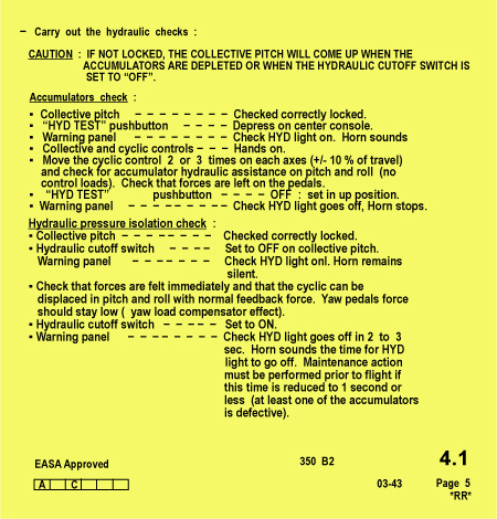 - The prescribed hydraulic system ground-test and in-flight procedures contained in the RFM are not consistent with Eurocopter's procedures and need to be clarified.