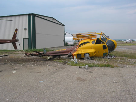 The helicopter quickly drifted backwards from the asphalt apron, turned about 90° to the left, and the tail guard on the lower vertical fin struck the ground and dug into the gravel surface now below. The helicopter slid back and rolled to the right, causing the landing skids and the main rotor blades to strike the ground. As a result of this heavy contact with the ground, the helicopter rolled over onto its right side. The rotor head and main rotor blades were destroyed; the blades shattered and were thrown over a large area. At the same time, the rear section of the tail boom broke off near the horizontal stabilizer forward attachment point and the tail rotor assembly tore out from the end of the tail boom.