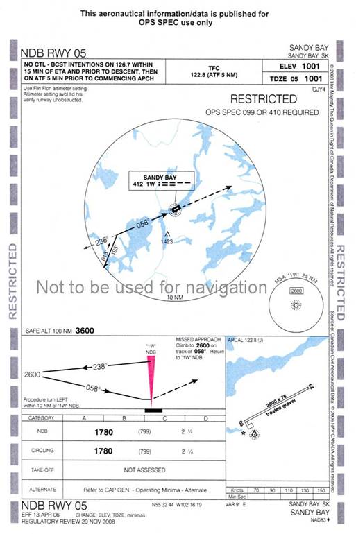 The captain broadcast a second arrival advisory on 122.8 MHz and the crew activated the Sandy Bay aerodrome lighting. The crew descended and positioned the aircraft for a straight-in approach based on the 25-mile minimum safe altitude of 2600 feet and the minimum descent altitude (MDA) for the approach, 1780 feet.