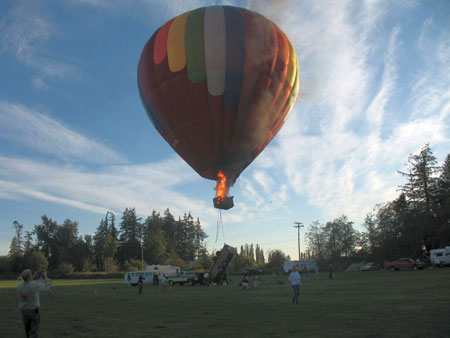 - During the initial envelope inflation, the balloon was fastened to its trailer, which was in turn attached to a pick-up truck. When the fire started and people began to evacuate the basket, the balloon began to rise because the emergency deflation system had not been activated. As people continued to evacuate the basket, they had to jump from a considerable height. Some suffered more serious injuries as a result of striking the trailer.