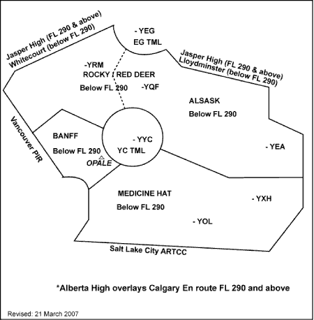 - All airspace over Alberta in the Calgary En route midnight configuration, excluding the two terminal control areas, would previously have been controlled by two controllers. As of 18 April 2008, a minimum of three controllers will provide traffic services during the midnight configuration.