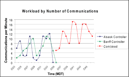 Although the requirement for flow control had just ended, the traffic level was considered to be moderate. The complexity was higher than normal for the time of day due to the flow control. In the 12 minutes preceding the sector combination, the Alsask and Banff controllers conducted an average of 6.0 and 6.2 communications per minute respectively, with each peaking at 11 per minute. After the sectors were combined, the relieving controller conducted an average of 11.7 communications per minute, peaking at 17 per minute (see Figure 2). When the relieving controller took his position, he was responsible for 20 aircraft in the combined sector.