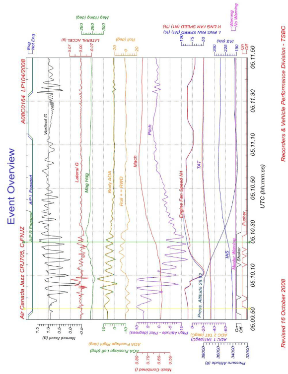 The crew was unaware that the airspeed had decreased and did not identify the cause of the rumbling. Analysis of the DFDR and the memory of the full authority digital engine control (FADEC) indicated that, when the power levers were advanced in response to the stick shaker and pusher activation, the engines (General Electric CF-34-8C5) responded but then spooled down to 49 per cent N1 and then recovered without input from the crew. The crew did not observe this rundown during the event. The SPS performed as designed. Movement of the control column and changes in the pitch angle of the aircraft were indicative of a pilot-induced oscillation. The SPS automatically activated the engine igniters as soon as the AOA exceeded the auto ignition firing angle. This occurred just prior to stick shaker activation.