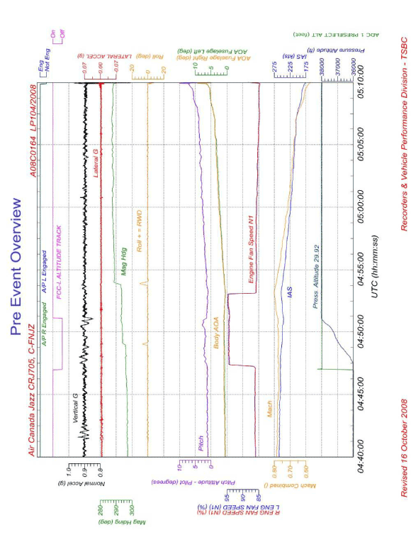 According to the digital flight data recorder (DFDR), approximately two minutes after levelling off, a stable airspeed of Mach .77or 243 knots indicated airspeed (KIAS) was maintained for several seconds only, after which it began to decrease. Gradually, over a period of about 17 minutes, the airspeed decreased to 180 KIASFootnote 3 as the angle of attack (AOA) gradually increased while the autopilot attempted to maintain altitude. Engine N1's and fuel flows also decreased about one per cent and 200 pounds per hour respectively as the aircraft decelerated. The aircraft was not equipped with auto thrust capability to maintain a selected speed or Mach number and the DFDR showed that the power levers were not adjusted in this timeframe.