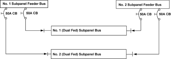 As shown in Figure 1, the No. 1 subpanel feeder bus provides power through a 50-amp subpanel feeder circuit breaker and a subpanel feeder diode to the No. 1 (dual-fed) subpanel bus. That same No. 1 subpanel bus is provided a second source of power from the No. 2 subpanel feeder bus through a separate 50-amp circuit breaker and diode circuit. The No. 2 subpanel bus is similarly arranged.