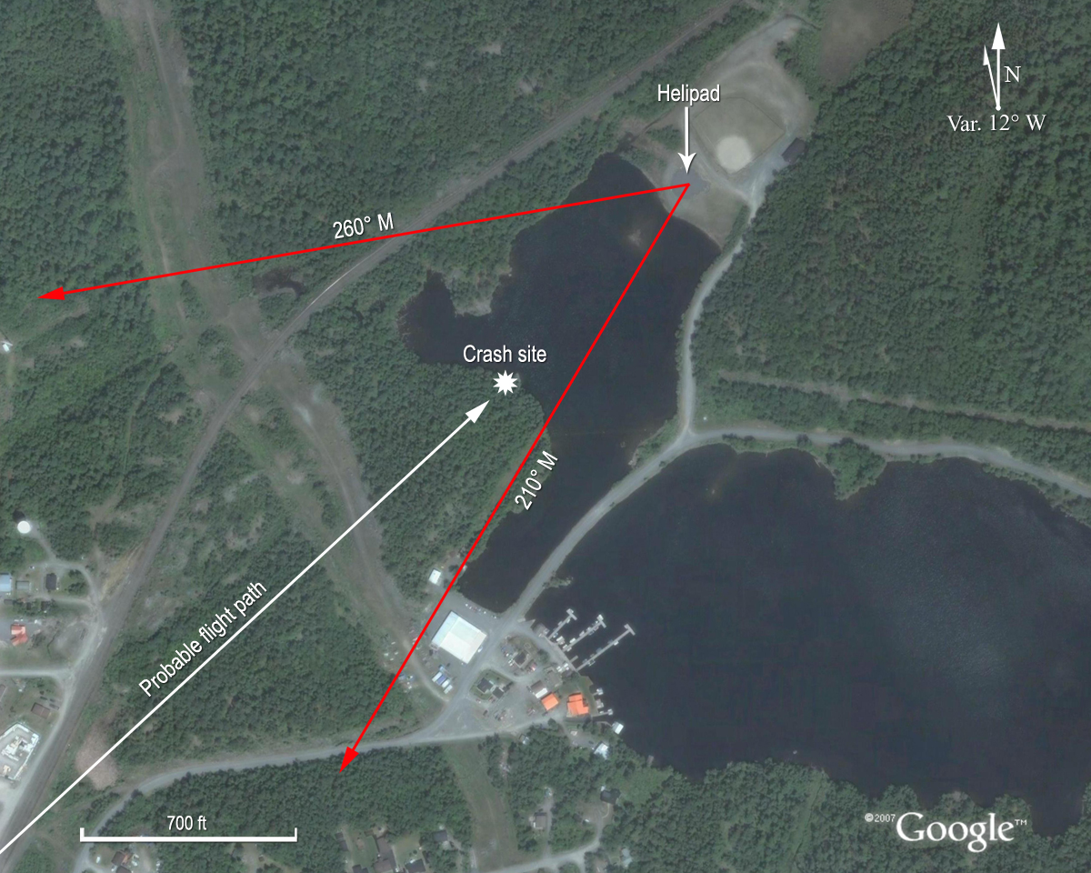 The helicopter approached the helipad from the southwest on a heading of approximately 048°M and entered the trees near the edge of the lake approximately 814 feet horizontally from the helipad (see Appendix B — Snake Lake Helipad).