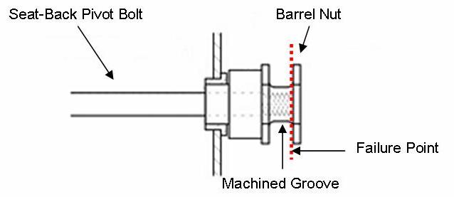 The lap belt barrel nut attachment failed due to several factors. First, the barrel nut was weakened due to wear from the stainless steel lap belt attachment. Second, the seat-back attachment bolt did not pass completely through the barrel nut, but instead passed only part of the way through to the end of the machined groove. This created a weak point on the assembly at the outside edge of the barrel nut. Under normal loads, such as forward and aft g-forces, this would not be an issue because the main load would be over the machined groove and seat-back attachment bolts. However, with a side impact, the main loads are in a sideways direction on the end barrel nut. This placed an abnormal load on the end of the barrel nut, which caused it to fail at the weakest point.