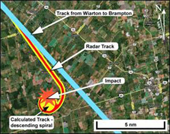 The flight path data from the radar recording showed that the aeroplane was in essentially straight and level flight between CYVV and CNC3 until 0424:30 when there was a distinct change in the flight path (see Figure 2). The remaining radar data showed a turn to the right and the beginning of a descent. The flight path from that point to impact was then reconstructed assuming no change to the aircraft trim condition (that is, no change of engine power and no change to control forces) and fine-tuning for wind and initial flight path angle. The resulting flight path is shown in Figure 3.