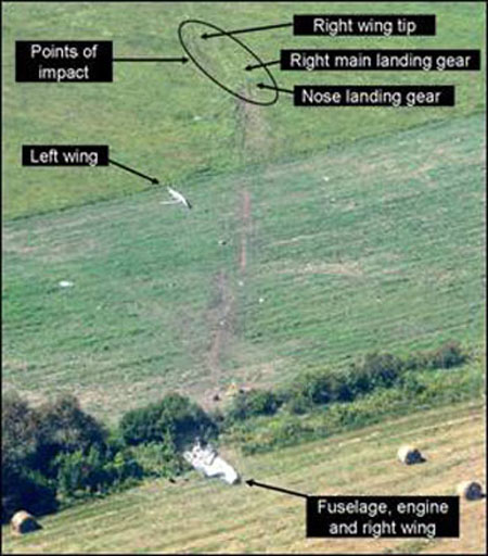 The aeroplane struck the ground on an easterly heading, approximately 45° right bank, pitch angle 7° to 8° nose down, airspeed 140 knots. Ground scars indicate that the aircraft’s right wing touched the ground first followed by the right main wheel and then the nose wheel. The aeroplane cartwheeled and began to break up. The left wing separated from the fuselage approximately 200 feet from the first point of contact. The main wreckage, consisting of the fuselage and right wing, was found about 430 feet from the initial point of contact. Various items from the cockpit, wing components, doors, and landing gear were found along the impact path. The aeroplane was destroyed (see Photo 1).