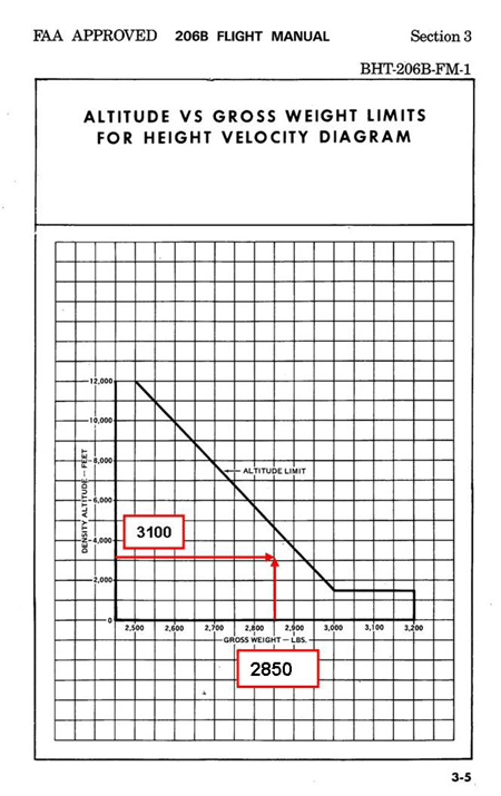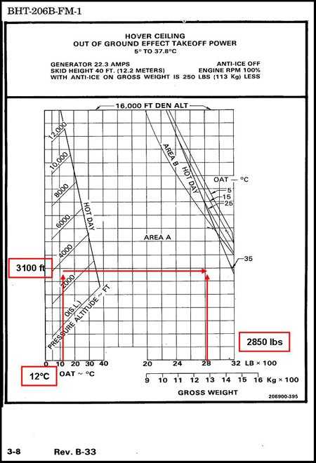 The crash site was about 3100 feet above sea level (asl) and, with an air temperature of 12°C, the density altitude would have been in the order of 3400 feet asl. With reference to the Bell 206B RFM, the hover ceiling out of ground effect (HOGE) chart ensures that the helicopter can hover without the performance benefit of ground effect, by providing a maximum allowable gross weight for varying conditions of pressure altitude and outside air temperature. For the environmental conditions at the time of the accident, the HOGE chart showed that the weight of the helicopter with the three occupants on board would have been within the HOGE performance capability of the helicopter (see Appendix C - Hover Ceiling Out of Ground Effect).