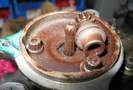 The left engine and its components were torn down, inspected, and tested with a TSB investigator present. The only significant anomaly found was that the high-pressure, engine-driven fuel pump drive splines were worn and corroded beyond the point of failure (see Photo 4 and Photo 5). Without fuel being supplied from the high-pressure fuel pump to the fuel control unit, the engine will shut down immediately.