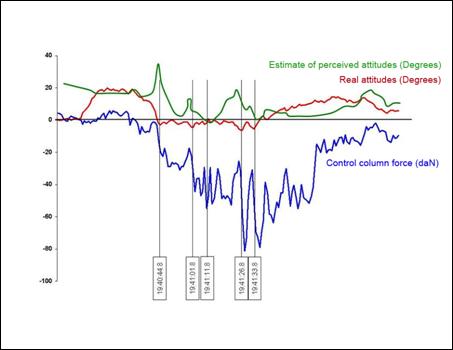 Since the co-pilot perceived no change in the aircraft’s attitude, he told the captain that he was taking control of the aircraft.Footnote 17 The captain let go of the control column, and fearing that the aircraft would enter a stall, he placed his hands in front of the control column to limit its movement towards the back.