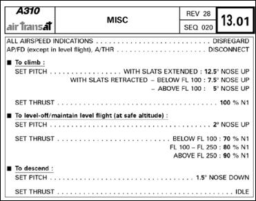 In 2007, after meeting the company’s requirements, he started his captain training. He completed classroom instruction and then simulator training given by Air Transat instructors. He passed the pilot proficiency check (PPC) as captain on the A310 on 05 December 2007. During a line indoctrination flight on 19 January 2008, the unreliable airspeed indication procedure was reviewed. His last check flight for initial qualification as captain completed under the supervision of an approved check pilot (ACP) was done on 24 January 2008. All training complied with the company’s training program. At the time of the occurrence, the captain had less than 100 flying hours as pilot‑in‑command on type.