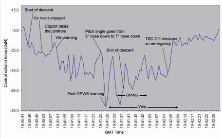 The aircraft was fitted with a Honeywell digital flight data recorder (DFDR), model SSFDR. It recorded more than 300 parameters and contained more than 53 hours of data, including the data for TSC211 and the nine previous flights. The DFDR as configured did not record the following information that could have helped determine the crew’s actions: the pilot’s and co-pilot’s control column force, and activation of the trim switch and radio switch located on the pilot’s and co-pilot’s control wheel. At TSB’s request, Airbus calculated the control column force from the data recorded on the FDR (see section 1.11.3).