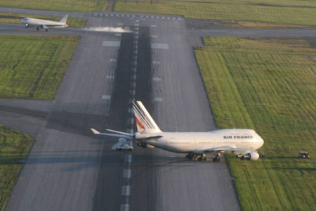 The Air France Boeing 747-428 aircraft (registration F-GITC, serial number 25344) departed Paris Charles de Gaulle International Airport, France at 1456 Coordinated Universal Time (UTC) as AFR346 on a scheduled flight to Montréal/Pierre Elliott Trudeau International Airport with 491 passengers and 18 crew members on board. The aircraft landed on Runway 24R at 2145 UTC. During the rollout, the aircraft veered to the right and the crew attempted to stop the turn while applying maximum braking. The aircraft stopped with the nose wheel landing gear 26 feet past the right edge of the runway, while the main landing gear remained on the runway. There were no injuries and the passengers disembarked using passenger transfer vehicles. The aircraft was not damaged and a post-flight inspection revealed no system malfunction.