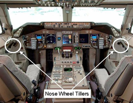 The design of the B744 nose wheel steering tiller originated in the late 1960s. The nose wheel steering controls required mechanical advantage while keeping the lever length to a minimum. The design considerations proposed a swivel handle to facilitate handgrip and to avoid breaking of the wrist during operation. The limited sweep clearance available for a horizontal tiller required the tiller to be placed off axis and in the vertical plane.