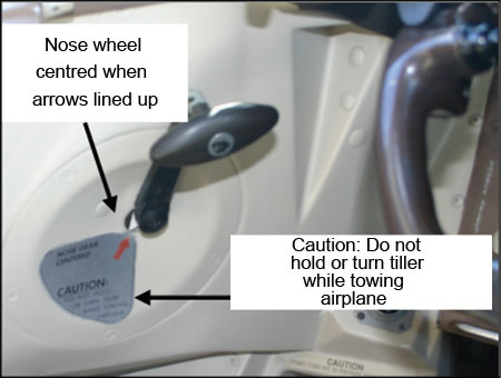 A hydraulically powered nose wheel steering is controlled by a tiller for each pilot to provide the primary low-speed steering of the aircraft on the ground (see Photo 2). A tiller movement of 150° clockwise will turn the nose wheels to the maximum steering angle of 70° to the right.Footnote 8 A pointer on the tiller indicates the position relative to the neutral/centred position. A caution label is also located near the pointer, advising personnel not to hold or turn the tiller while towing the airplane (see Photo 3).Footnote 9