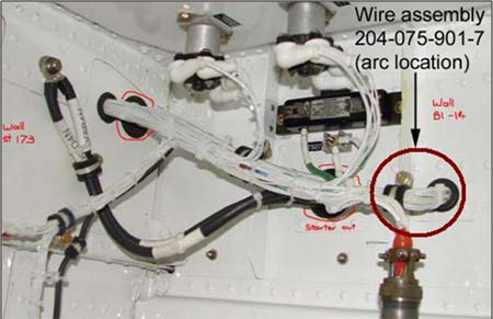 Examination of the engine electrical harness, at the juncture of the oil cooler blower compartment and the aft electrical compartment wall, revealed electrical arcing on 19 individual wires. Eleven of the 19 arced wires were located in wire assembly 204-075-901-7 running to the engine deck cannon plug J92 (see Photos 2, 3, and 4). Four of the 11 arced wires in wire assembly 204-075-901-7 were identified as to their function.