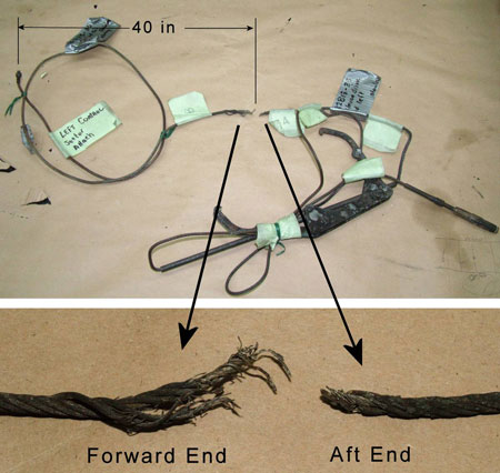 Displaced away from the fracture location, some cable strands and splayed wires were found at the forward end of the fracture at the 40-inch location. The aft end of the fracture was roughly cone-shaped (see Figure 1).