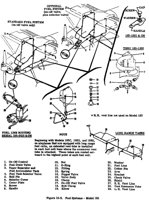A float-type fuel sending unit is mounted in each tank which connects to a fuel quantity gauge on the instrument panel. The aircraft is not equipped with a low-fuel warning system or light. Fuel flows by gravity from each wing tank through fuel supply lines at the forward and aft lower inboard corners of the tank. The fuel supply lines connect to an accumulator tank mounted under the instrument panel on the engine firewall. Fuel from the accumulator tank flows through a fuel shut-off valve, a fuel strainer, and a by-pass in the electric auxiliary fuel pump (when it is not operating) to the engine-driven fuel pump. The electric auxiliary fuel pump is a two-speed HI and LO position pump normally used for engine start or for vapour purging. The HI position is intended for use in an emergency situation if the engine experiences a loss of power.