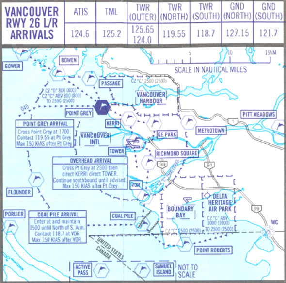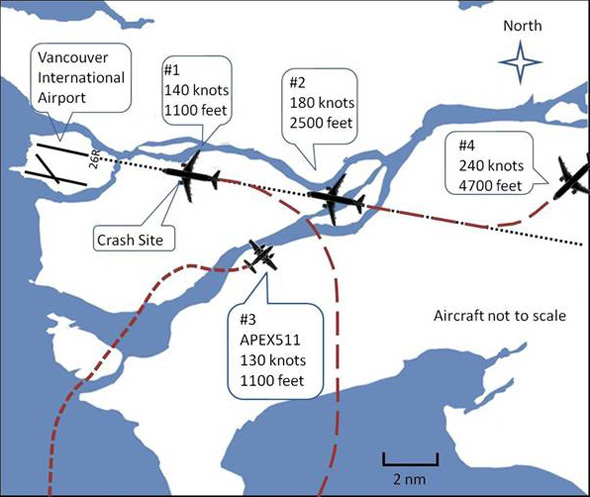 At 2157, Footnote 1 the crew of APEX 511 made initial contact with Vancouver tower 20 nautical miles (nm) south of the airport at 1500 feet above sea level (asl). The flight was among 4 aircraft inbound to Vancouver at the time; the other 3 were larger Airbus aircraft under the control of Vancouver terminal arrival controller. The first was joining left base from the southeast, the other 2 straight-in from the east. The Vancouver tower airport controller directed the crew of APEX 511 to follow the published Coal Pile visual flight rules (VFR) arrival route for Runway 26R (see Appendix A).