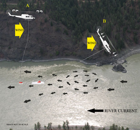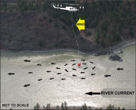 At the time of the occurrence, four helicopters were engaged in forest fire water bucketing operations approximately 20 nm south of Lillooet. They were using the Fraser River to fill their water buckets. At the accident location, the Fraser River is in a canyon and was flowing south at about 9 knots. The pilots had chosen a spot in the river where there was a whirlpool. The backside of the whirlpool is characterized by back-flowing current in the opposite direction to the river current. The pilots were dipping their buckets in this back-flowing water, which prevented the current from dragging them downstream (see Figure 1).