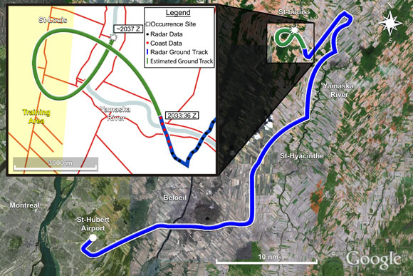 There were several aircraft in the assigned training areas that day. Radar data showed that C-GJAE first travelled east past Beloeil towards the training area closest to Montréal/Saint-Hubert Airport (CYHU), then north of Saint-Hyacinthe towards another training area located 27 nautical miles (nm) to the northeast of CYHU (see Appendix A - Aircraft Trajectory). This is likely because the closest training area was crowded. While C-GJAE made its way north, the radar data shows the aircraft in level flight, climbs, and descents.