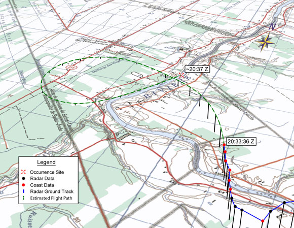 After leaving CYHU tower frequency, the occurrence flight instructor made two position reports-one en route at 1604Footnote 2 and the other at 1622 once they reached the training area to the north. No other radio calls were made. The last valid radar position at 1633 shows the aircraft at an altitude of 1340 feet above sea level (asl) on a true track of 341 degreesFootnote 3 with a ground speed of 90 knots. The last coastingFootnote 4 target of the aircraft was captured at 1634. The radar floorFootnote 5 is approximately 1000 feet asl in the area of the occurrence. No global positioning system (GPS) information was available because the unit had been turned OFF prior to departing CYHU.