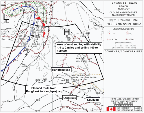 On 17 July 2009, the pilot arrived at the airport around 0730. At the Kuujjuaq Flight Service Station (FSS), he obtained weather information for Kangirsuk (CYAS) and Kangiqsujuaq (CYKG). As graphic area forecast (GFA)Footnote 2 weather charts were not available,Footnote 3 he was told that a call could be placed to the Flight Information Centre (FIC) in Québec, Quebec. According to the information received, the pilot did not phone the FIC in Québec or the FIC in Halifax, Nova Scotia. He delayed his departure due to the unfavourable weather. On the ground at Kuujjuaq, he contacted the CHL Goose Bay base for an update on the weather on the planned route. It could not be determined if the pilot obtained weather information from the Internet.