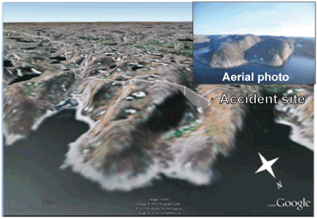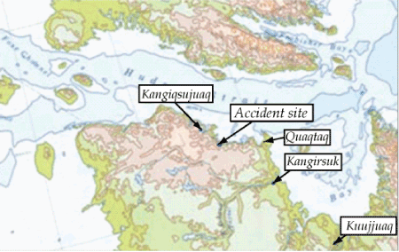 The accident occurred a little under 1 nm from the Hudson Strait in a coastal valley lying 36 nm southeast of Kangiqsujuaq. The valley is about 2300 feet wide and runs inland toward the west between two rocky escarpments. The elevation of the ridgeline on the south side is 1050 feet asl, and that of the north ridgeline is about 820 feet asl. The aircraft was on a northerly heading when it struck the north wall of the valley at about 700 feet asl.