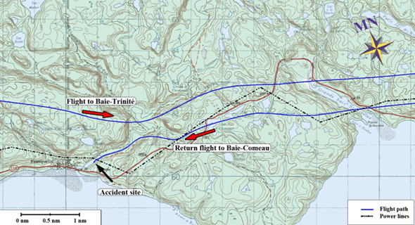 Because of the chosen route and the way the power line zigzags across the landscape, the pilot crossed the line 3 times on the return trip to Baie-Comeau. The helicopter would have crossed the power line a fourth time at the Franquelin river location on the edge of the St. Lawrence River. Franquelin is situated on the direct VFR route between Baie-Comeau and Sept-Îles, Quebec.